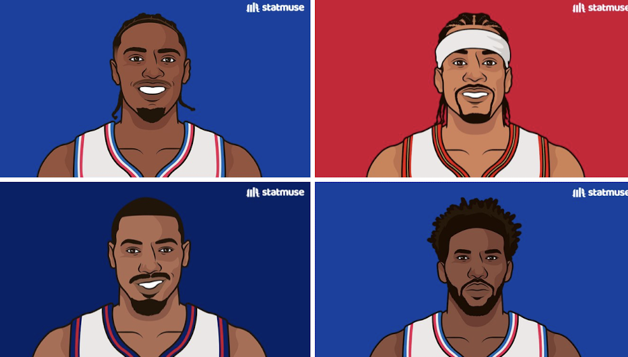 76 人隊中生涯至少5次單場(chǎng)40+得分的場(chǎng)砍球員:馬克西、艾弗森、恩比德、張伯倫。