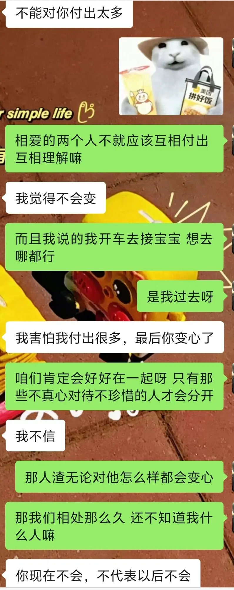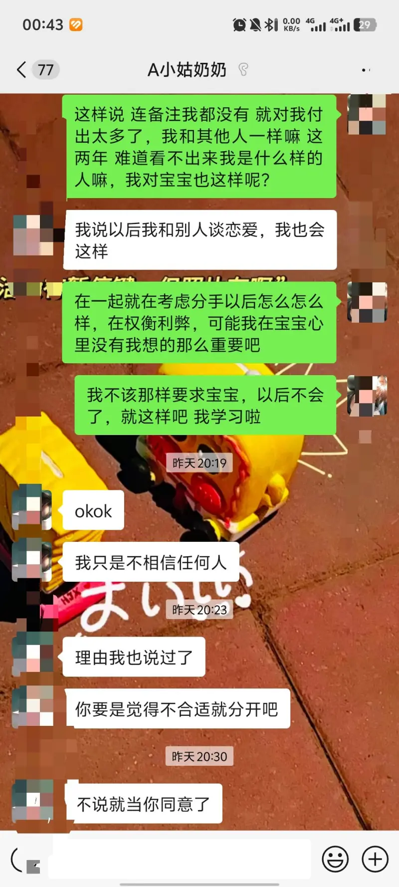 回家路上突然和我說(shuō)下面圖片的東西,前面我說(shuō)我元旦考完試,開(kāi)車(chē)去找她帶她出去玩(國慶的時(shí)候開(kāi)車(chē)去找他了四百多公里第一次開(kāi)長(cháng)途,還是短續航電車(chē),開(kāi)了八九個(gè)小時(shí)),帶她多吃點(diǎn)好吃的,她就是要和我保持距離,不能對我付出太多,看到這我就感覺(jué)很難受,明明平時(shí)我付出的很多,我也沒(méi)想過(guò)這些,就是覺(jué)得兩個(gè)人相愛(ài)這些都是應該的,看著(zhù)她開(kāi)心,我也開(kāi)心,一開(kāi)始她說(shuō)這個(gè)可能是沒(méi)安全感,在辯解幾句,可是越說(shuō),她就是說(shuō)對所有人都這樣,不相信任何人,我就說(shuō),我說(shuō)什么人相處那么久,我是什么樣的人,咱們應該知道呀,我就感覺(jué)明明是純粹的感情,感覺(jué)她在權衡利弊,在算得失,感覺(jué)她可能不怎么愛(ài)我,就回想很多,想到最開(kāi)始什么都和我分享,現在很少和我分享東西,一開(kāi)始早安晚安都會(huì )說(shuō),現在什么都不說(shuō),慢慢地我也不發(fā)早安了,發(fā)了半天不理我,然后等她想起來(lái)找我,就直接忽略我發(fā)的,她之前給我說(shuō)早上來(lái)不及,我每天給她發(fā)晚安,第二天也不回,和我說(shuō)話(huà)很沒(méi)有耐心,經(jīng)常兩句話(huà)說(shuō)差了,就生氣了,沒(méi)有耐心聽(tīng)我說(shuō)清楚,但是平時(shí)相處也能感覺(jué)到她也是愛(ài)我的,