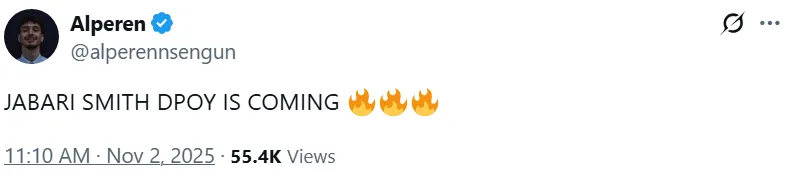 賽后,阿爾佩倫-申京發(fā)推,并稱(chēng)贊了小賈巴里-史密斯在防守端的表現,他寫(xiě)道: