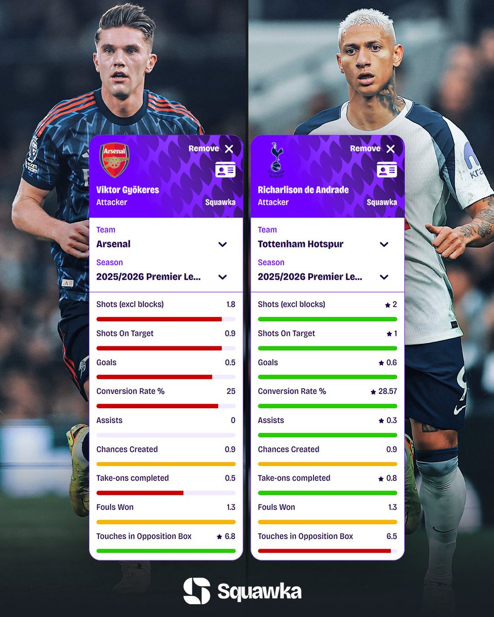 虎撲11月20日訊 Squawka數據統計,對比哲凱賴(lài)什與里沙利松本賽季英超每90分鐘數據表現:(哲凱賴(lài)什列前)