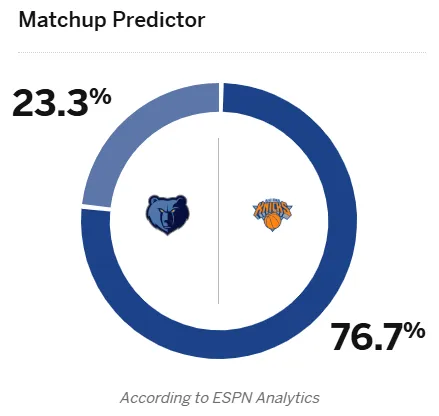 賽前,灰熊美媒ESPN預測本場(chǎng)比賽,尼克尼克斯勝率高達76.7%,斯勝灰熊勝率為23.3%。流言率高? ?