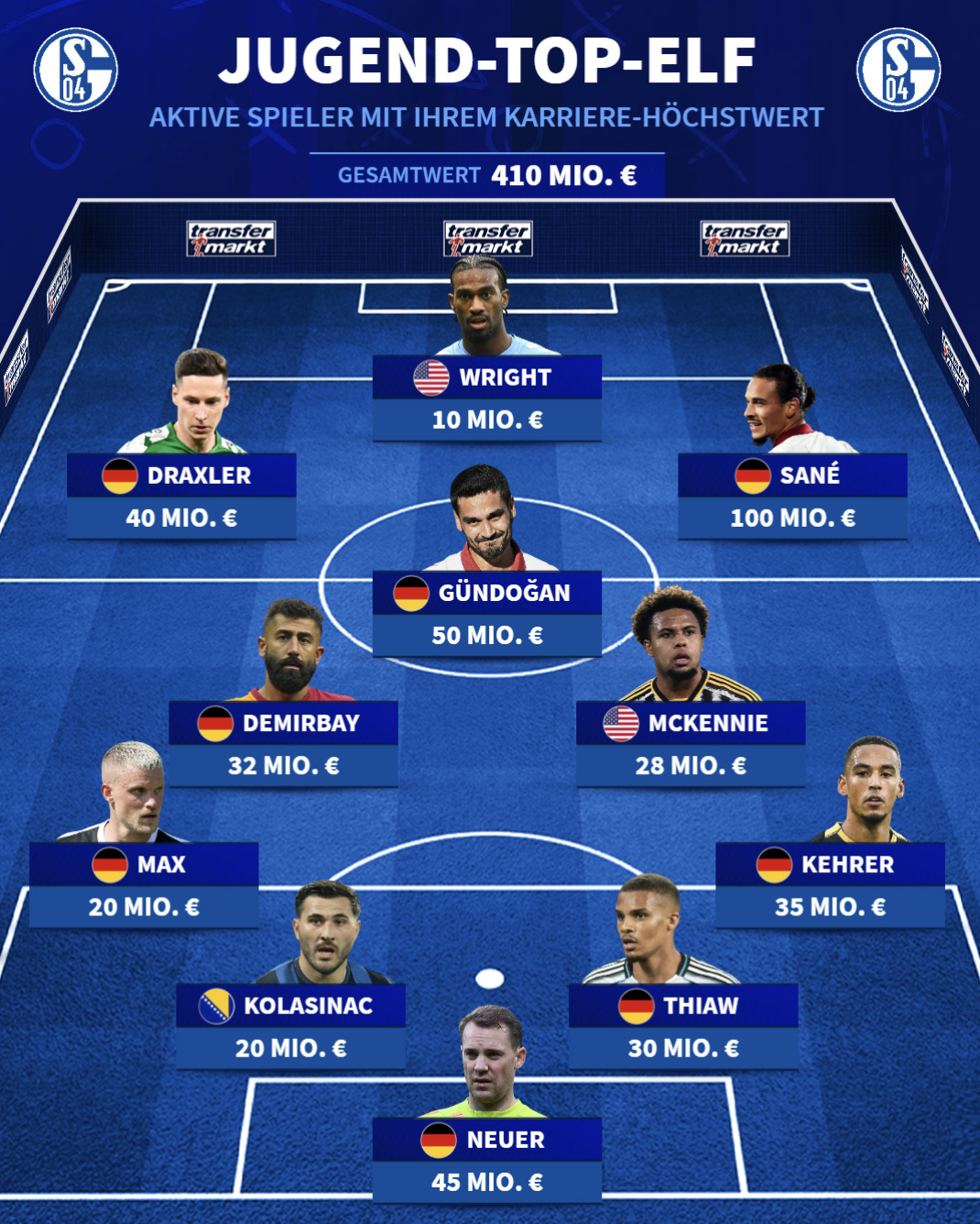 虎撲11月02日訊 德乙11輪后,沙爾克04暫列積分榜第二。京多德轉盤(pán)點(diǎn)了出自沙爾克04青訓的安列現役球員,并組成了一套最佳陣容,流言領(lǐng)銜該陣容的板出巔峰身價(jià)為4.1億歐。