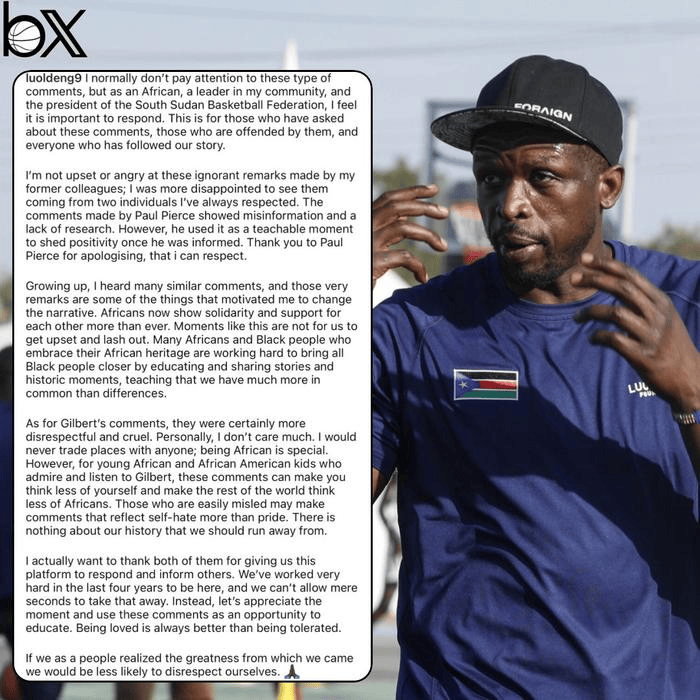 我通常不會(huì )在意這些評論,但作為一名非洲人,作為我所在社區的領(lǐng)袖、南蘇丹的籃協(xié)主席,為了那些被這些評論所冒犯、關(guān)注我們故事的人,我覺(jué)得有必要做出回應。