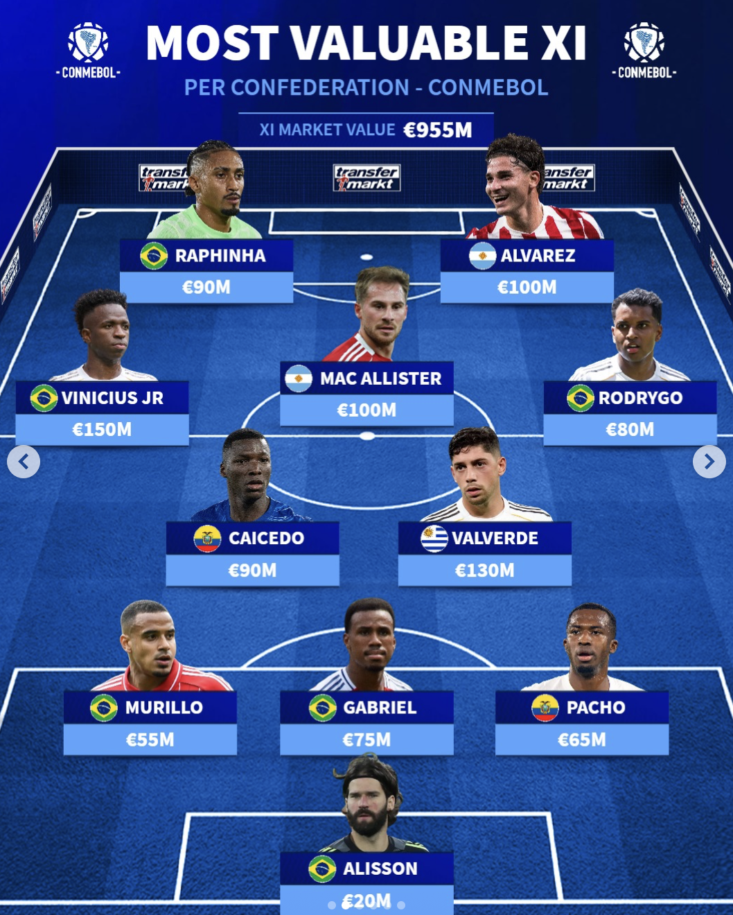 陣容總身價(jià)為9.55億歐,容維入選其中巴西有6人入選;阿根廷和厄瓜多爾各有2名球員入選。尼修巴西球員維尼修斯以1.5億歐領(lǐng)銜陣容。斯億