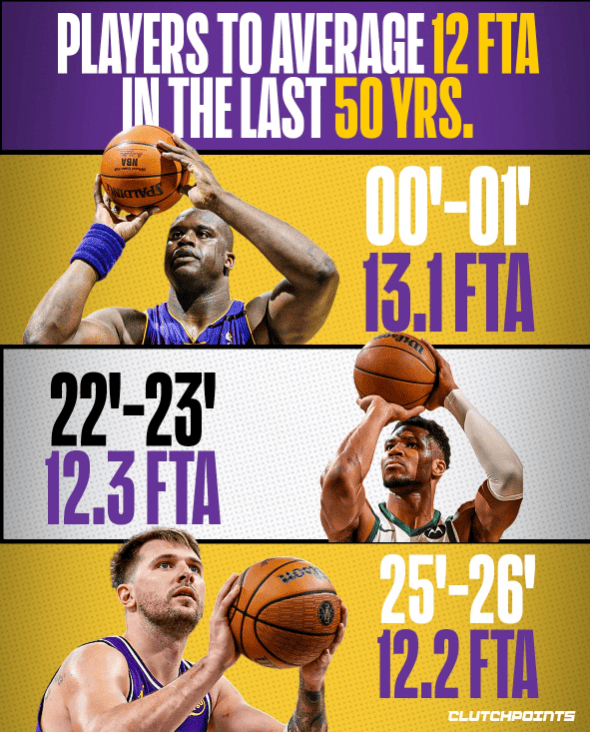 [流言板]近50年場(chǎng)均至少12次罰球出手的球員:奧尼爾、字母、東契奇
