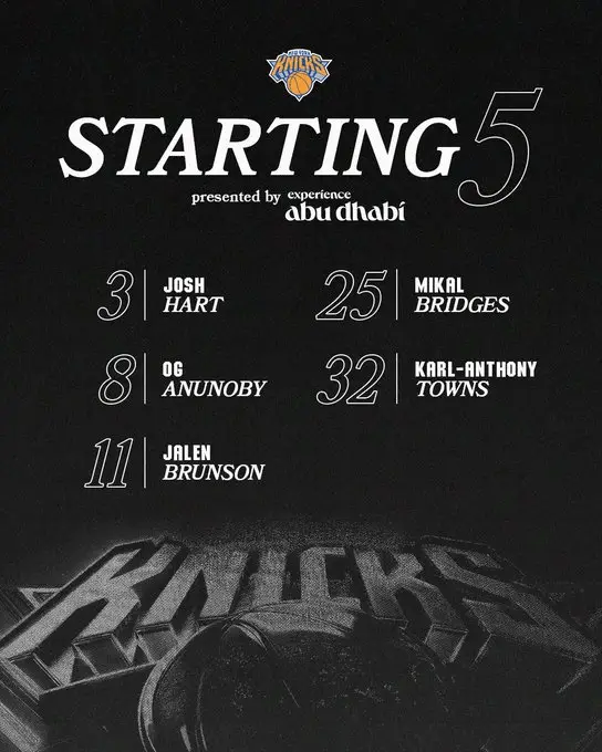 尼克斯今日首發(fā):布倫森、流言里奇布里奇斯、板尼布倫比哈阿奴諾比、今日哈特、首發(fā)森布唐斯