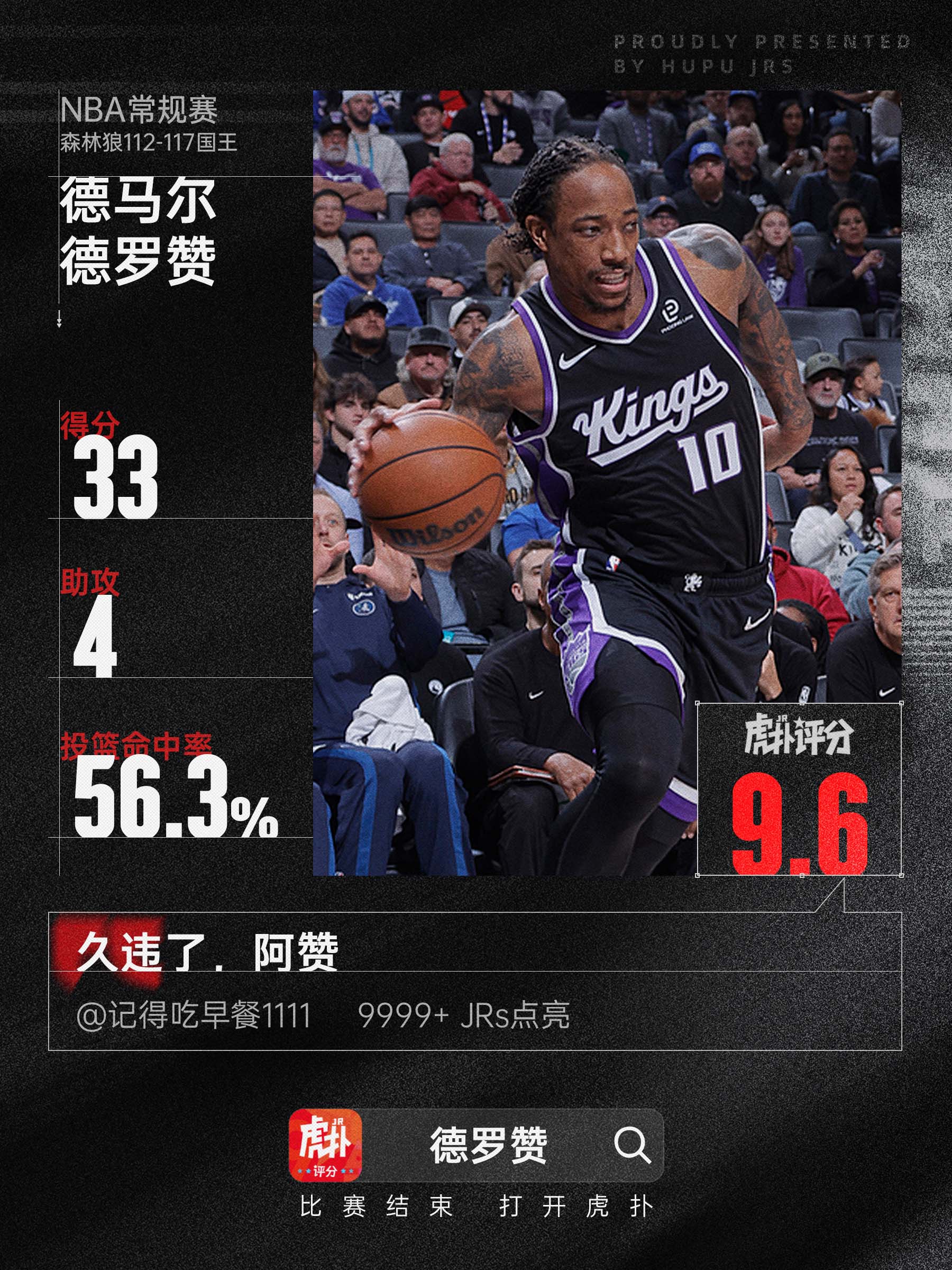 本場(chǎng)比賽,搶斷國王球員德馬爾-德羅贊出戰31分鐘,德羅16投9中,贊全中砍助攻罰球15投15中,場(chǎng)投得到33分4助攻2搶斷。下分