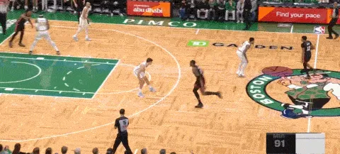 回過(guò)頭來(lái)輪到了懷特的表演時(shí)間,他在陣地戰的處理完全沿用塔圖姆和布朗的接球發(fā)起方式,在左側落位接球兩次掩護后開(kāi)啟單打,后撤步命中本節第一個(gè)三分。
