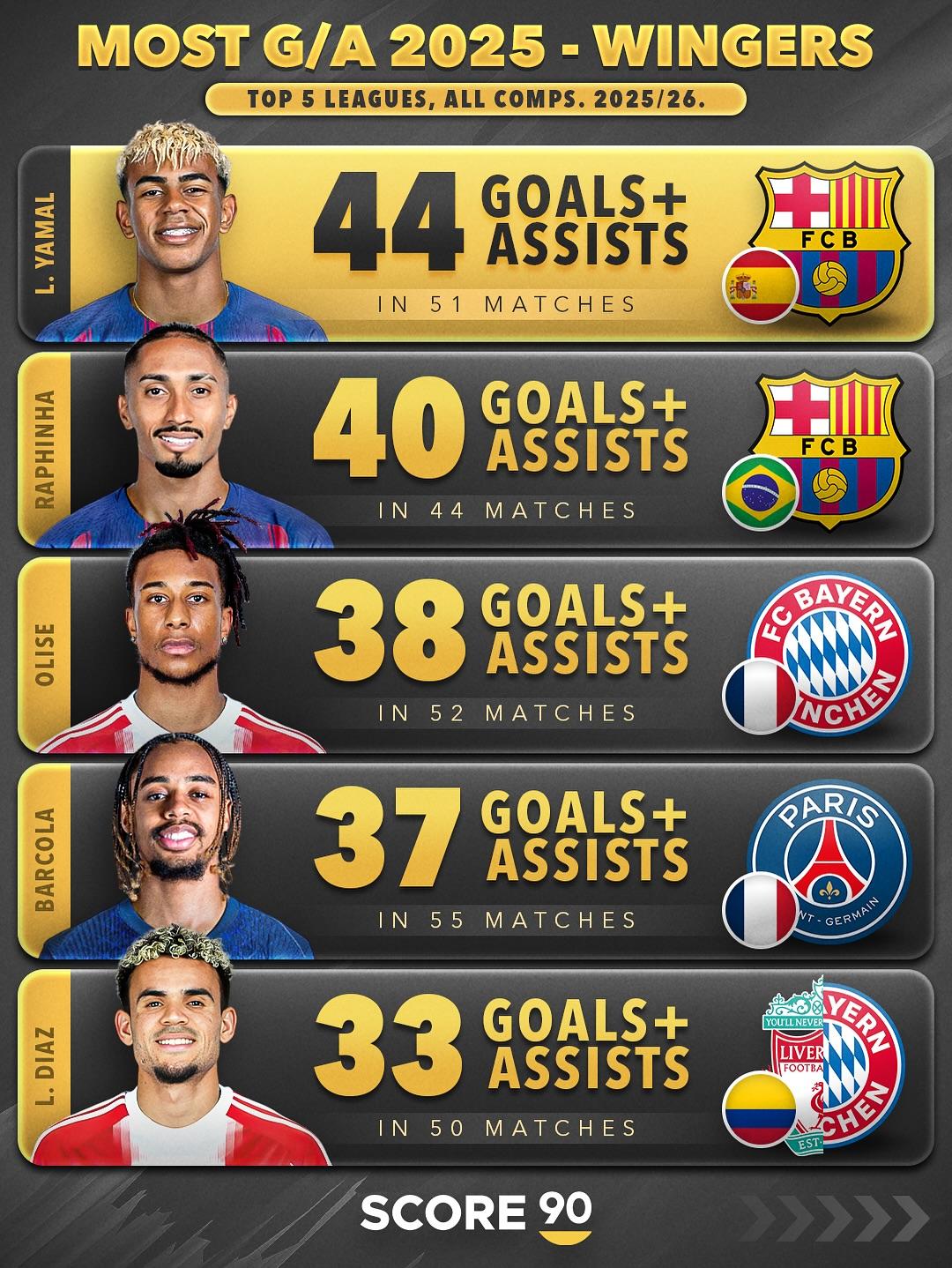 虎撲11月10日訊 Score 90統計了2025年在各項賽事(包括俱樂(lè )部和國家隊)中參與進(jìn)球最多的五大聯(lián)賽邊鋒球員: