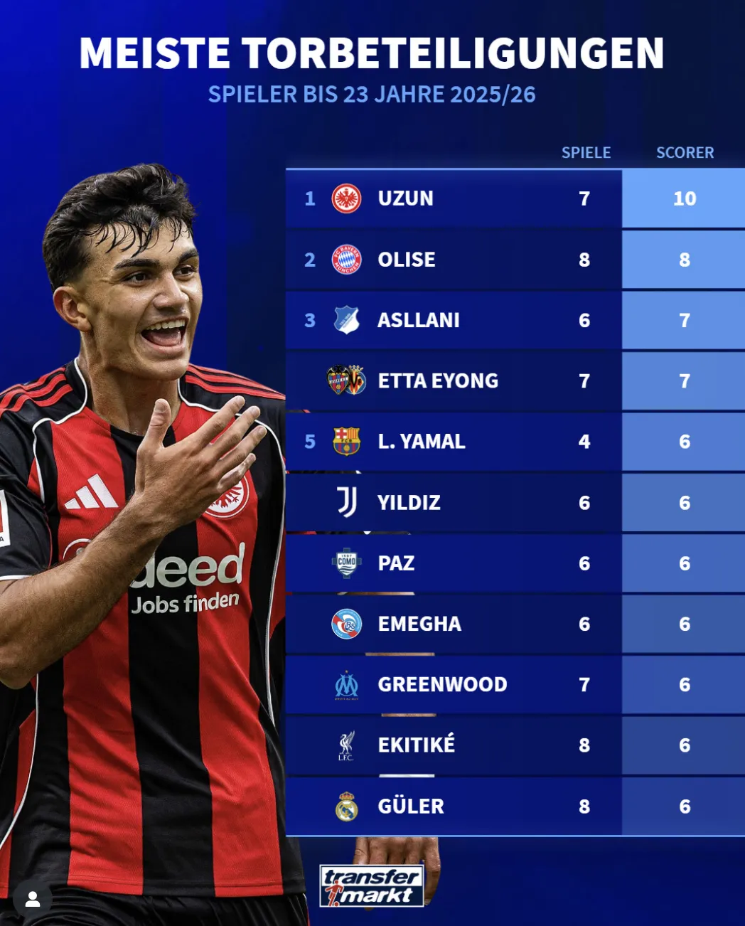 法蘭克福的烏尊烏尊以7場(chǎng)10次排名第一,拜仁的首奧奧利塞以8場(chǎng)8次排名第二。