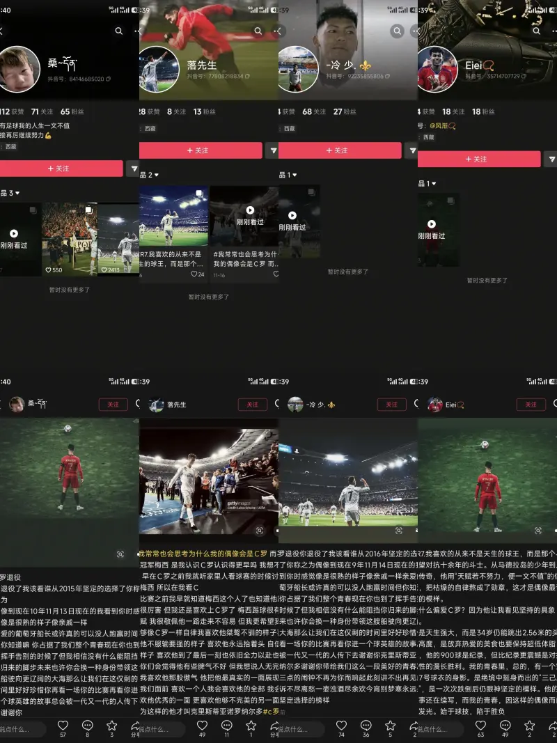 大體的形式比較固定,大篇幅的文案加上c羅的配圖,文案內容基本雷同,有關(guān)“我心中的球王”“我觀(guān)看c羅踢球的心路歷程”,大篇幅的文案,以及用點(diǎn)陣擺成CR7等字樣。
