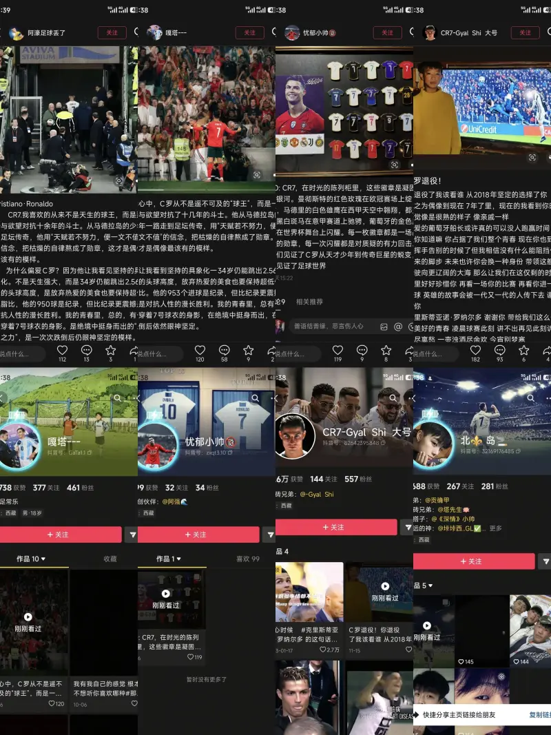 這幾天的抖音確實(shí)刷吐了,尤其是c羅肘擊事件之后,有很多賬號出現并且進(jìn)行發(fā)雷同文。