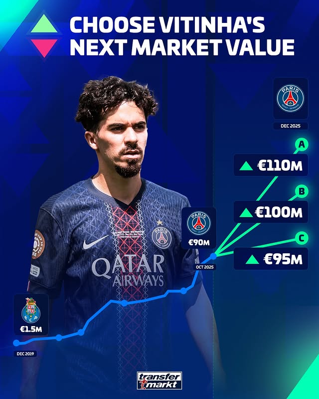 德轉更新社媒為即將到來(lái)的新身法甲球員身價(jià)更新進(jìn)行預熱,圖中顯示維蒂尼亞的價(jià)最最新身價(jià)至少將上漲至9500萬(wàn)歐,最高可達1.1億歐元。歐最歐