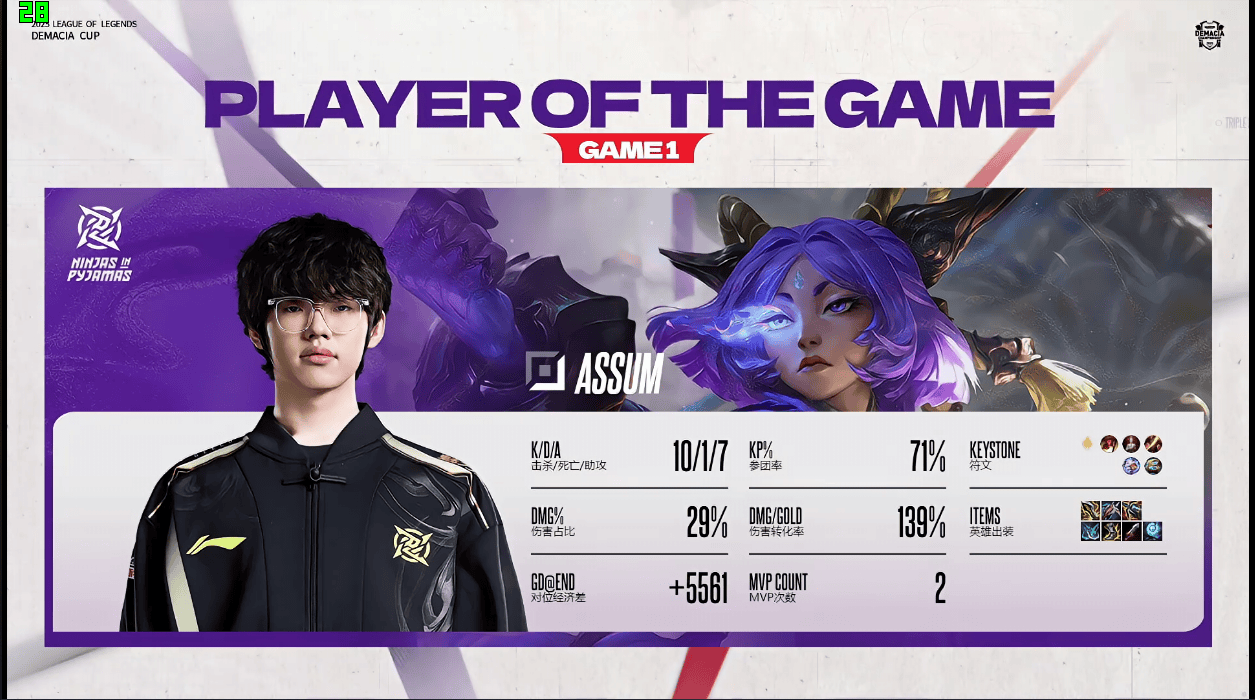 虎撲12月20日訊 在剛剛結束的NIP對陣LGD的BO3比賽中,Assum使用蕓阿娜打出10/1/7戰績(jì),出戰斬獲NIP對陣LGD第一局MVP