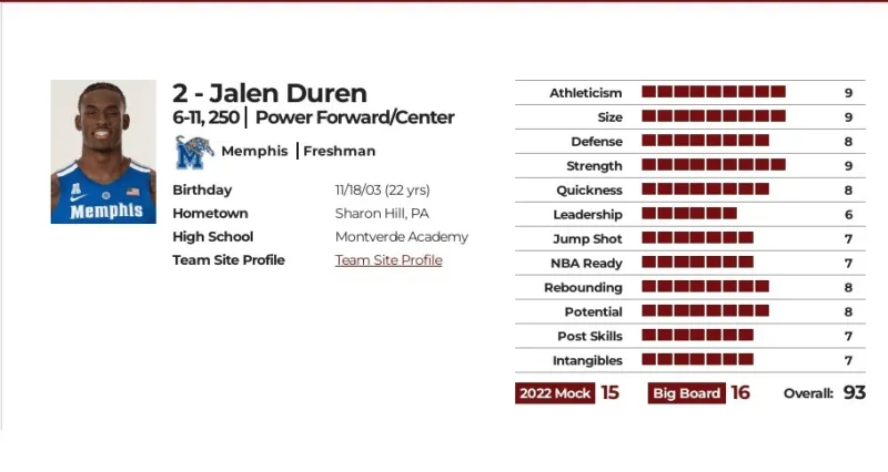 杜倫高中畢業(yè)時(shí)ESPN綜合評分97分五星高中生,在全美百大高中生排名第7,在中鋒位置位列第2,僅低于切特-霍姆格倫,后來(lái)選秀聲望直線(xiàn)下跌有三個(gè)原因,一是技術(shù)過(guò)于粗糙,他一直到上初二才真正練習籃球,基本功比較差,進(jìn)入大學(xué)后技術(shù)短板徹底暴露,二是NCAA瘋狂三月首輪直面對位切特,結果被切特防的非常狼狽,三是孟菲斯大學(xué)學(xué)長(cháng)懷斯曼在NBA表現的一塌糊涂,讓人們對孟菲斯大學(xué)主教練便士-哈達威的招募眼光以及培養中鋒能力產(chǎn)生巨大質(zhì)疑,各種因素交織下,選秀順位不斷下跌。