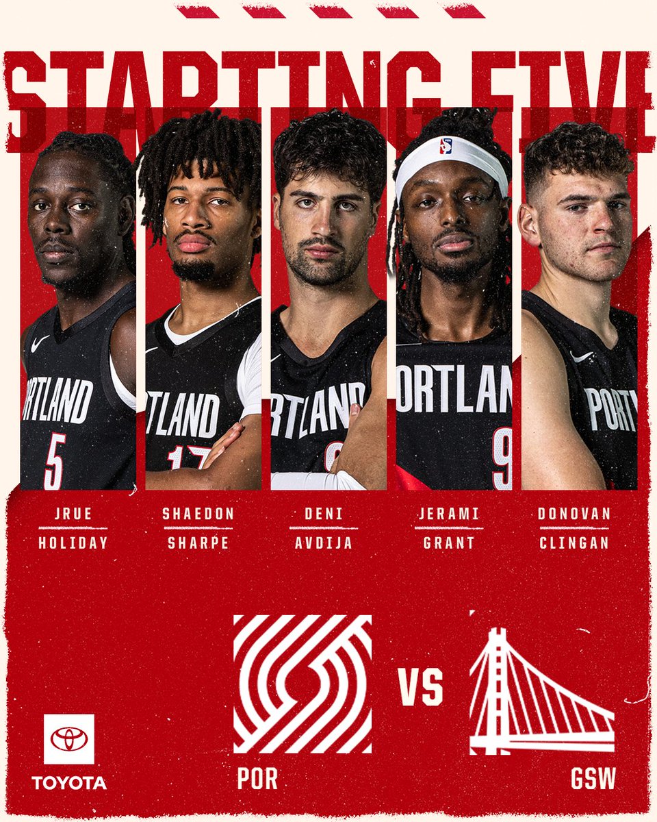 開(kāi)拓者本場(chǎng)首發(fā):朱-霍勒迪、克林謝登-夏普、流言蘭特德尼-阿夫迪亞、杰拉米-格蘭特、多諾萬(wàn)-克林根。