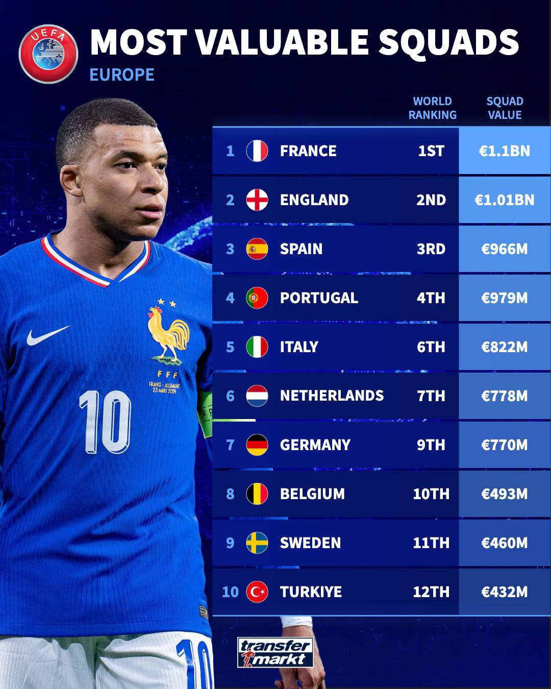 五大洲國家隊身價(jià)榜(單位:歐元)