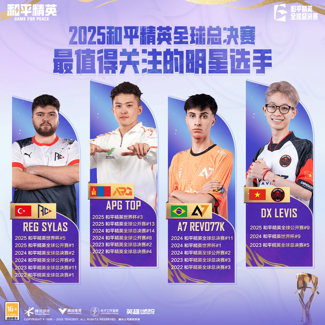 2025和平精英全球總決賽最值得關(guān)注的手覽明星選手來(lái)啦!快點(diǎn)擊圖片了解這些選手的星選過(guò)往榮譽(yù)吧~