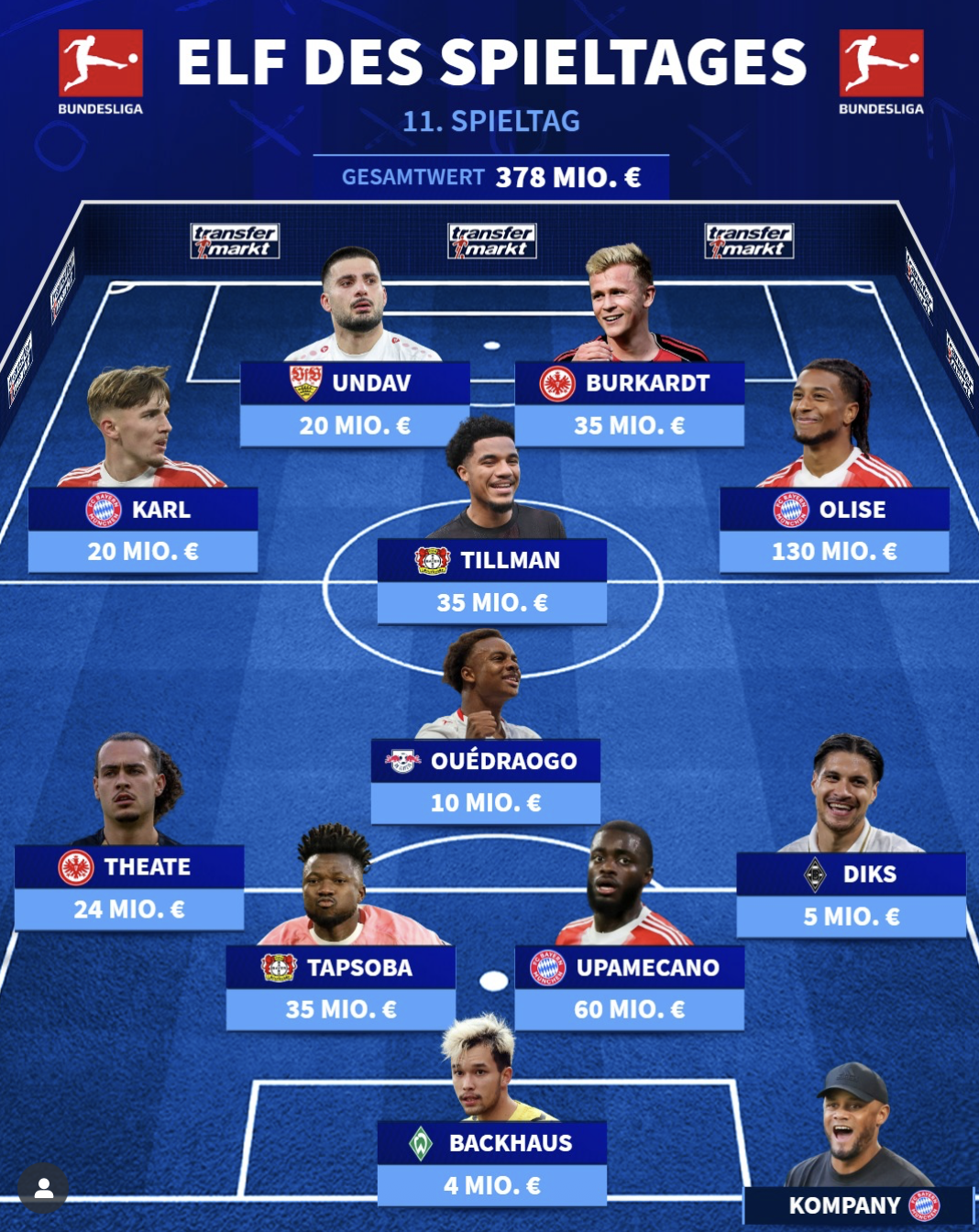 虎撲11月24日訊 德轉公布了德甲第11輪最佳陣容(總身價(jià):3.78億歐)。拜仁的烏帕奧利塞和烏帕梅卡諾領(lǐng)銜陣容。