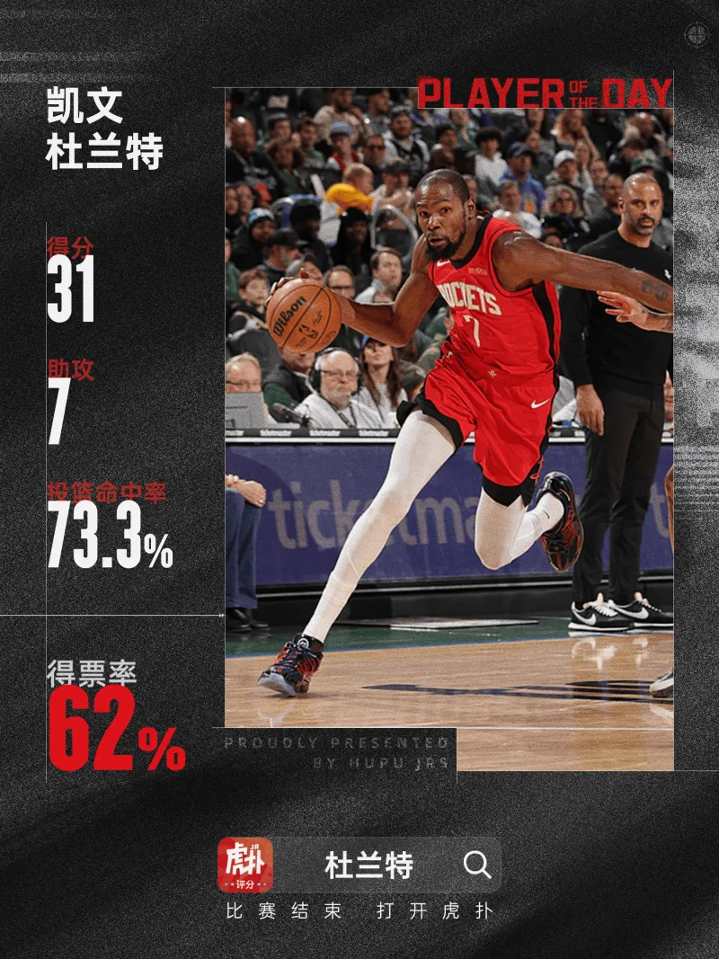 全場(chǎng)比賽,率隊火箭球員凱文-杜蘭特首發(fā)出戰37分鐘,15投11中,三分球2投2中,罰球9罰7中得到31分3籃板7助攻。