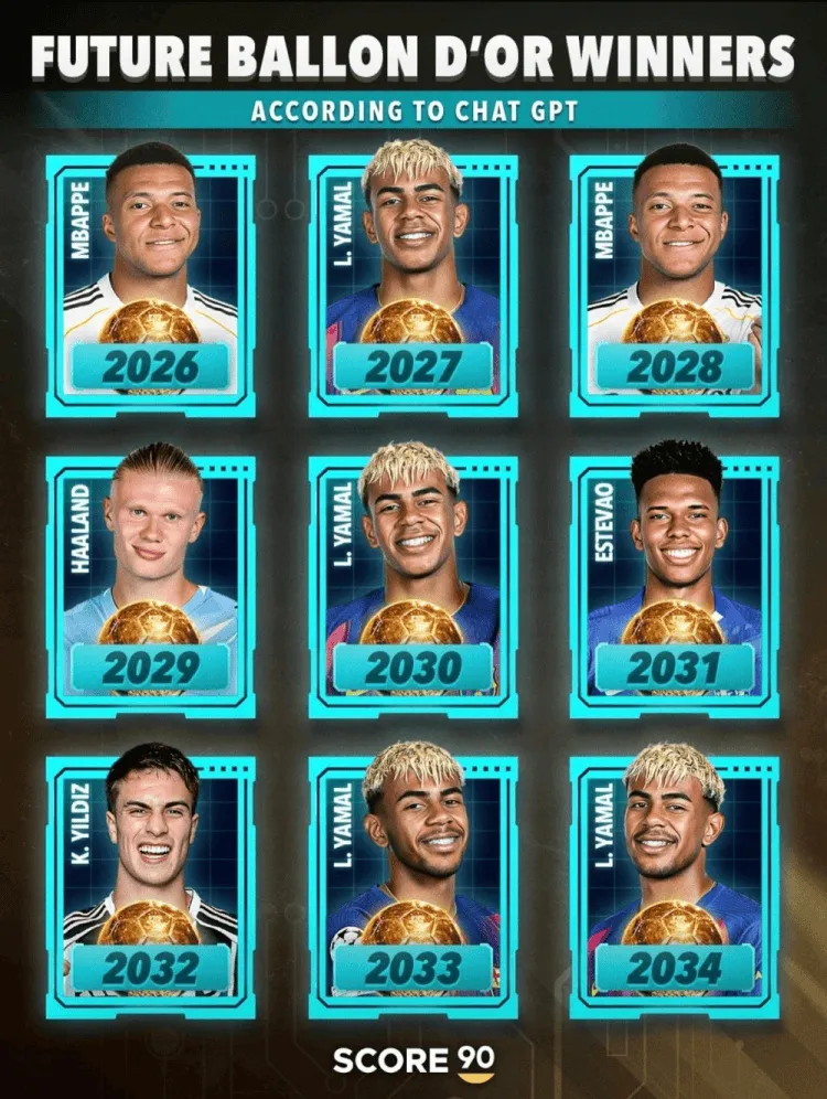 ChatGPT對未來(lái)9年金球獎獲獎?wù)呙麊芜M(jìn)行了預測。其中,球獎亞馬爾4次拿金球、名單姆巴姆巴佩則是佩次2次。