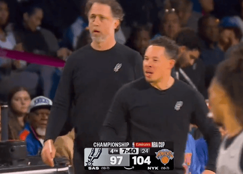 虎撲12月17日訊 NBA杯決賽,馬刺迎戰尼克斯的奇叫比賽正在進(jìn)行中。比賽的暫停第四節,尼克斯打出一波進(jìn)攻高潮將比分反超。怒噴