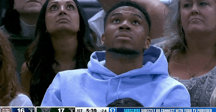 第一節比賽中,直接坐進(jìn)戰和掌字母哥直接坐進(jìn)觀(guān)眾席觀(guān)戰,觀(guān)眾和球迷一起鼓掌。球迷起鼓