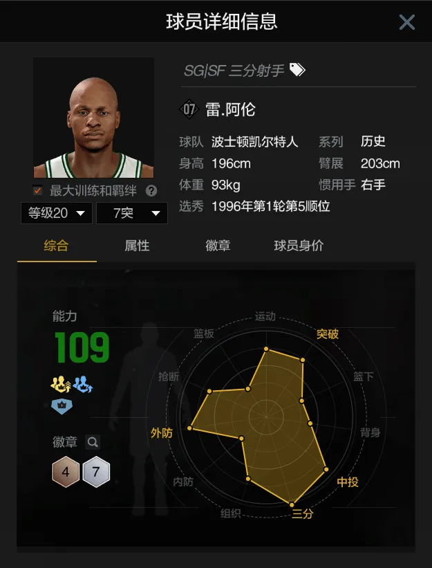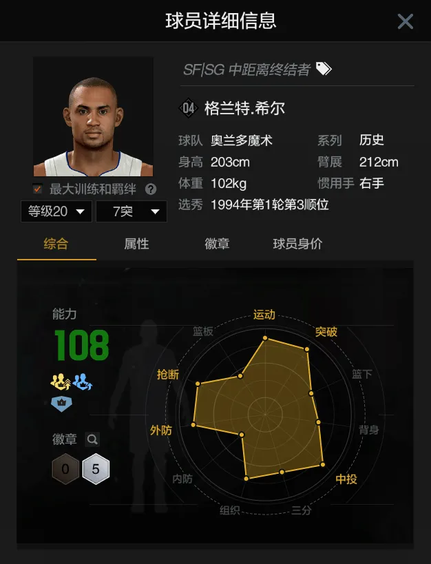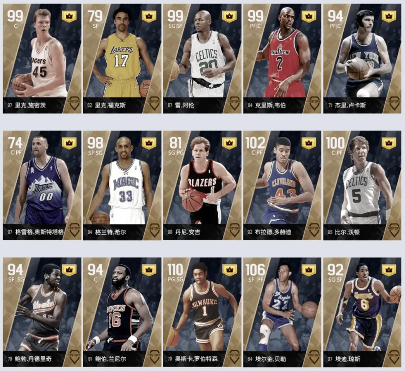 第十位格蘭特希爾,這張卡推出早期就有很多玩家為游戲強度打抱不平,三分球數值僅僅給到了83,徽章也只有五枚,后續有望推出更強版本的二輪希爾。