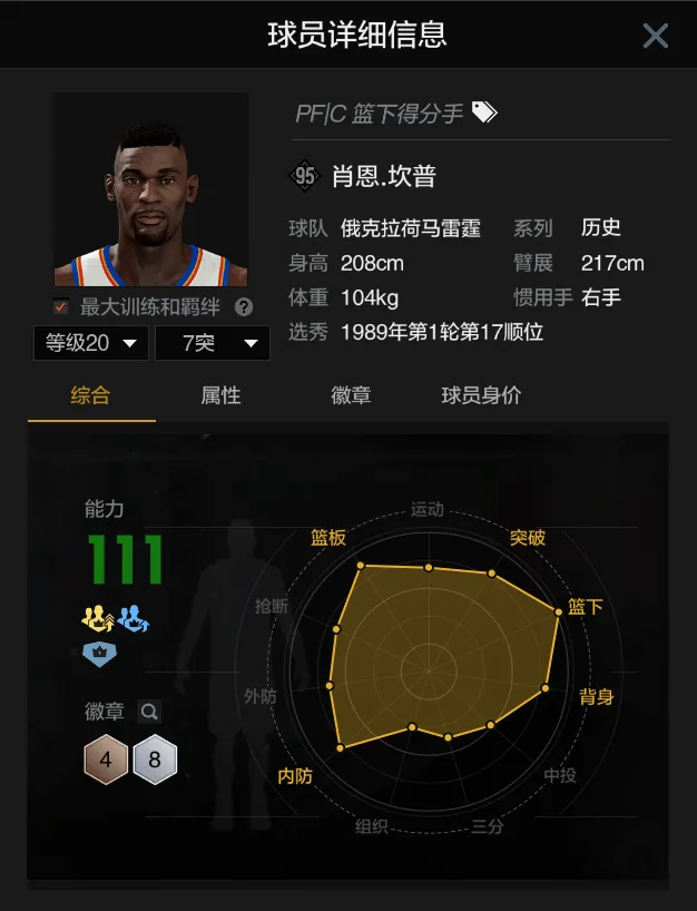 第五位肖恩坎普,運動(dòng)能力出色,終結能力出色,輕松解鎖雙籃板動(dòng)畫(huà),但防守端表現一般,體力也支撐不了三節比賽時(shí)間,目前游戲里仍有一定的上場(chǎng)率。