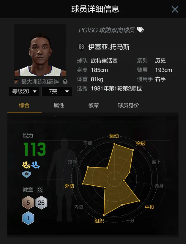 第八位伊塞亞托馬斯,由于模型因素,這張卡游戲實(shí)用性始終不算太好,游戲早期徽章怪的代表性球員之一,相信不久的將來(lái)二輪歷史系列托馬斯就會(huì )上線(xiàn)。