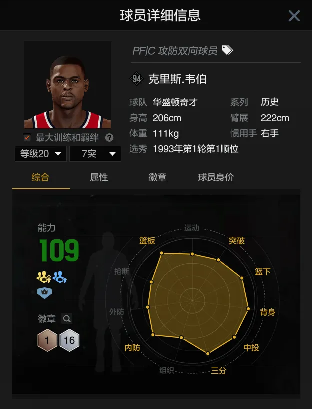 第四位克里斯韋伯,這張卡算是該屆歷史系列比較常青樹(shù)的球員了,直到如今仍然是平民頂級的內線(xiàn)球員,運動(dòng)能力出色,有投射有籃板有終結,還是邁克爾喬丹的運球風(fēng)格。