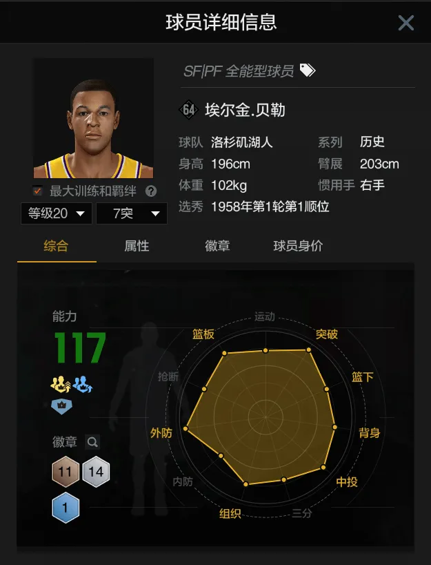 第三位埃爾金貝勒,同樣游戲強度始終不算頂級,且現版本的投籃包速度相比上個(gè)內核更慢了,游戲里后續同樣會(huì )推出紫徽章版本的貝勒爺。