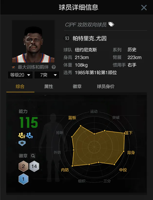 第六位帕特里克尤因,早期輪椅型內線(xiàn)的代表性球員之一,彈跳數值僅僅51,橫移速度慢,雖然徽章質(zhì)量還算可以,但游戲強度始終不算太好,這張卡后續大概率會(huì )推出更強版本的二輪歷史系列。