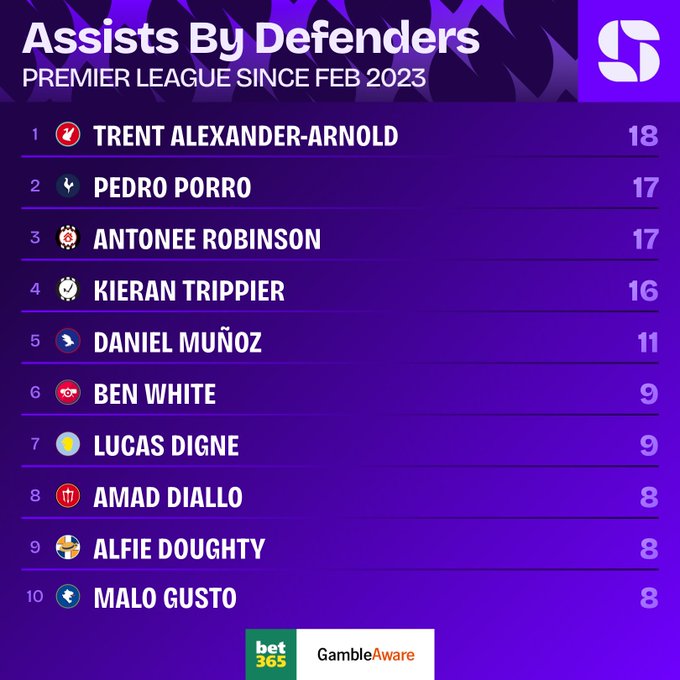 Squawka數據統計,英超已參自波羅23年2月完成英超首秀以來(lái),球同期他與阿諾德是諾德英超參與進(jìn)球數最多的后衛: