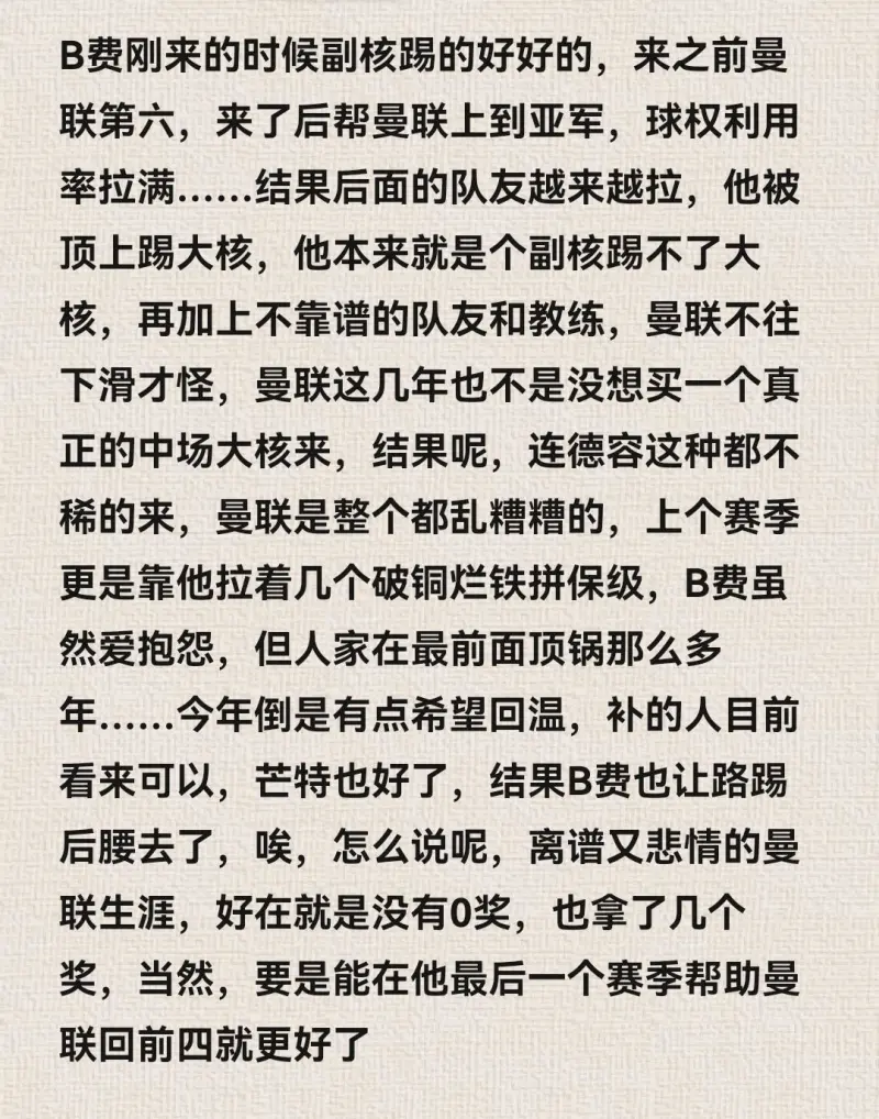 回顧B費曼聯(lián)生涯有感,當然他也吃了很多紅利,譜又比如世界第一聯(lián)賽大豪門(mén)核心球星地位,悲情第一隊長(cháng)地位,其實(shí)第一點(diǎn)球手地位,聯(lián)生攤手抱怨地位……也是涯離因為有曼聯(lián)他才能被葡萄牙國家隊看到,我只能說(shuō),譜又互不相欠吧……