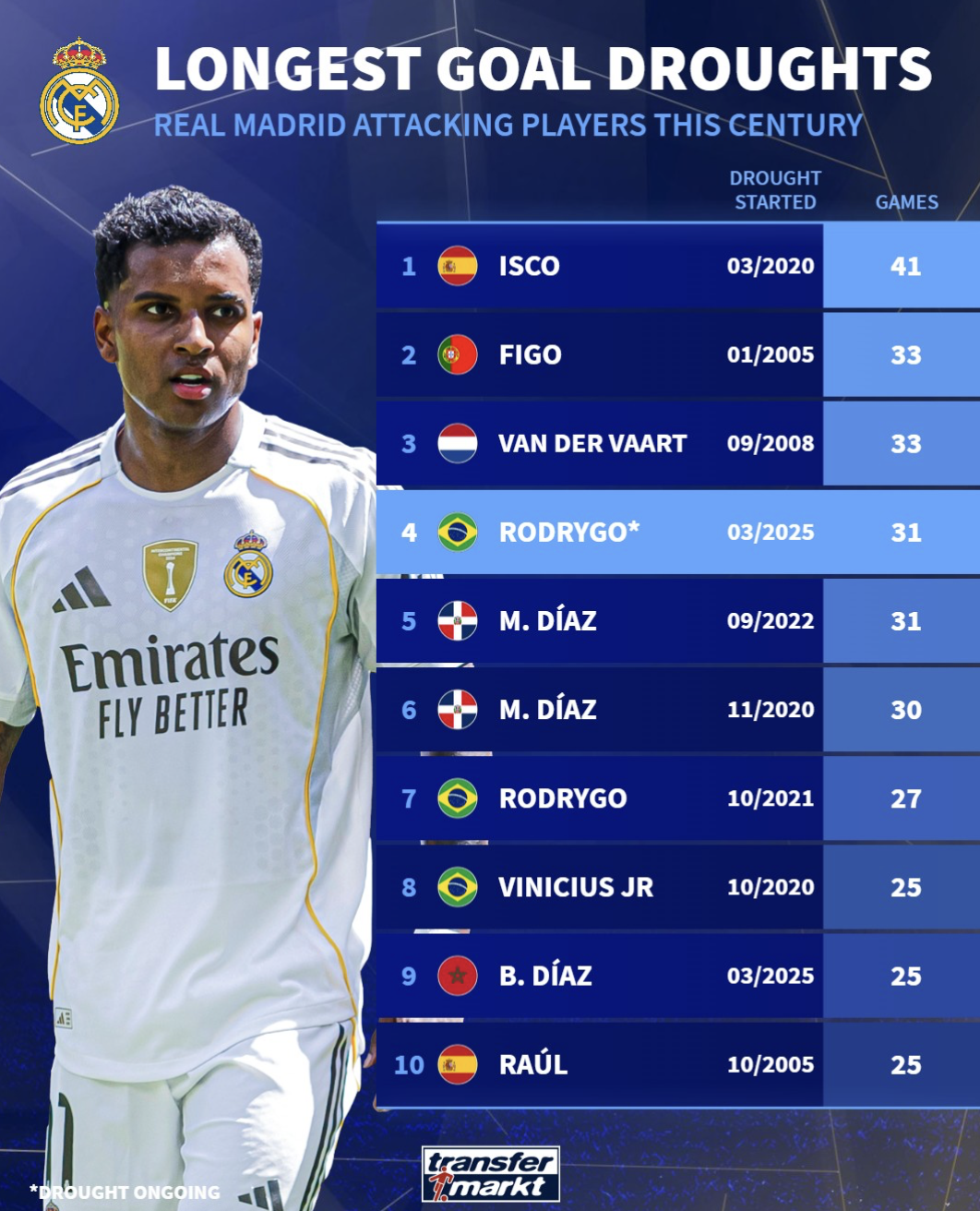 伊斯科曾自2020年3月起連續41場(chǎng)沒(méi)進(jìn)球居首,世紀菲戈和范德法特曾分別連續33場(chǎng)球荒排名二三?;蜀R荒榜今年的攻擊羅德里戈已連續31場(chǎng)沒(méi)進(jìn)球排名第四。