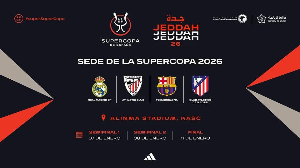 虎撲09月29日訊 西班牙足協(xié)官方宣布,2026年西班牙超級杯半決賽對陣已經(jīng)確定:巴塞羅那將迎戰畢爾巴鄂競技,而馬德里競技則與皇家馬德里交鋒。賽事將在沙特阿拉伯吉達舉行,這座被聯(lián)合國教科文組織列為世界遺產(chǎn)的城市將連續第二年、也是第三次承辦超級杯。