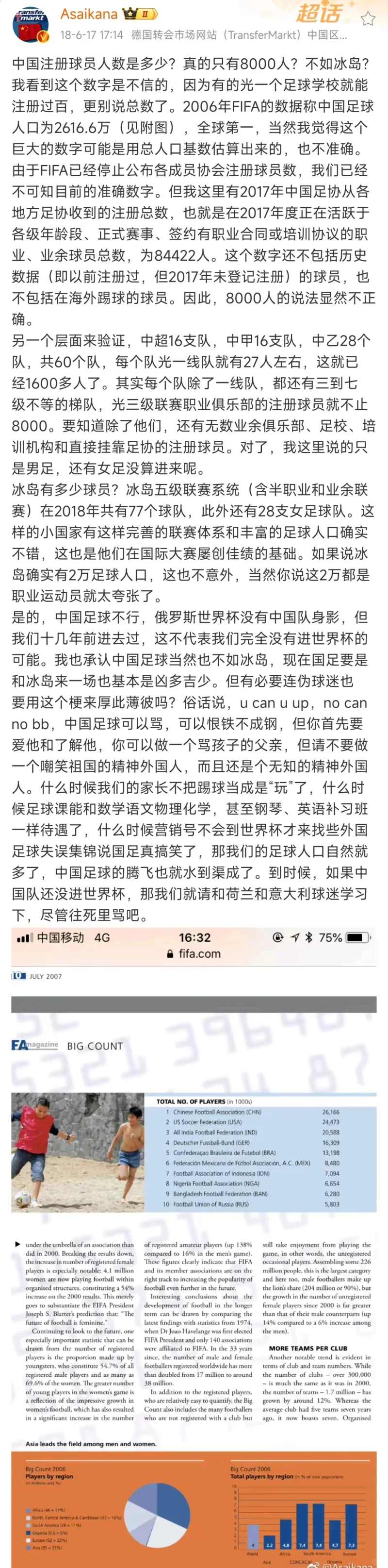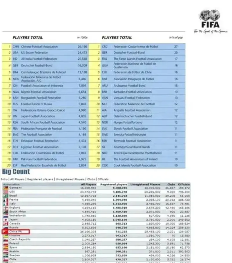 說(shuō)句大家不愛(ài)聽(tīng)的,中國足球人口都高于韓國,足協(xié)就是拿足球人口甩鍋大環(huán)境罷了,無(wú)論是FIFA官網(wǎng)還是德轉市場(chǎng),無(wú)論是其它官媒曝光,還是部分城市的市體育局報告,都能看出中國足球人口雖然遠低于日本,但高于韓國。