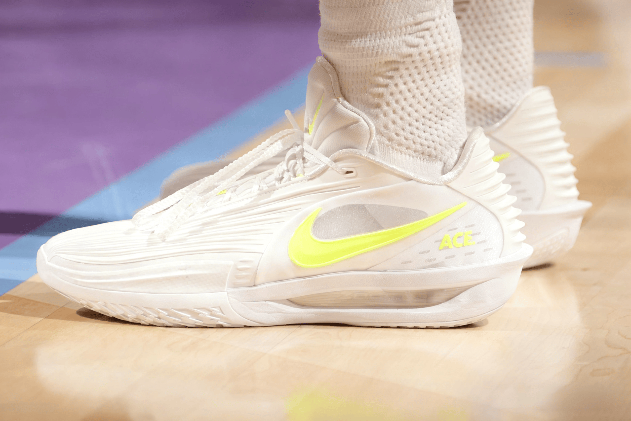 比賽中,人專(zhuān)貝利上腳個(gè)人專(zhuān)屬白綠色Nike G.T Cut3 Turbo PE,屬白后跟處印有其名字暨logo“ACE”。分籃
