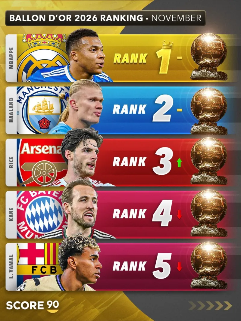 Scroe90:金球獎目前賠率(截止11月)姆巴佩位居榜首