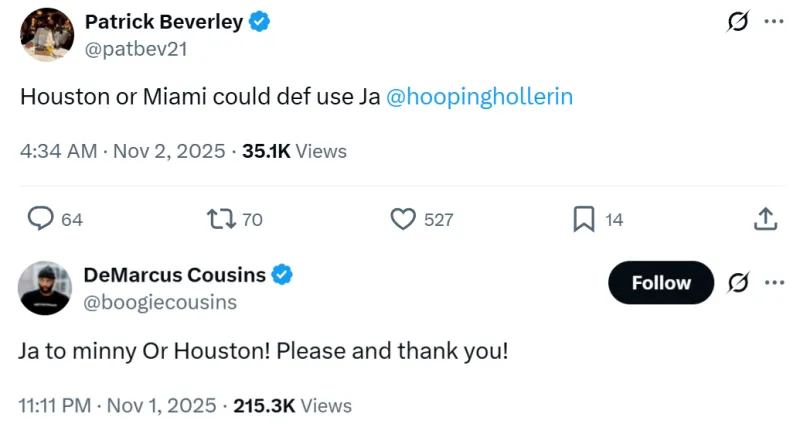 在莫蘭特被灰熊內部禁賽一場(chǎng)新聞出來(lái)后,前NBA球員考辛斯這么寫(xiě)道:“莫蘭特去森林狼或者火箭吧,拜托了,謝謝你?!?/p>