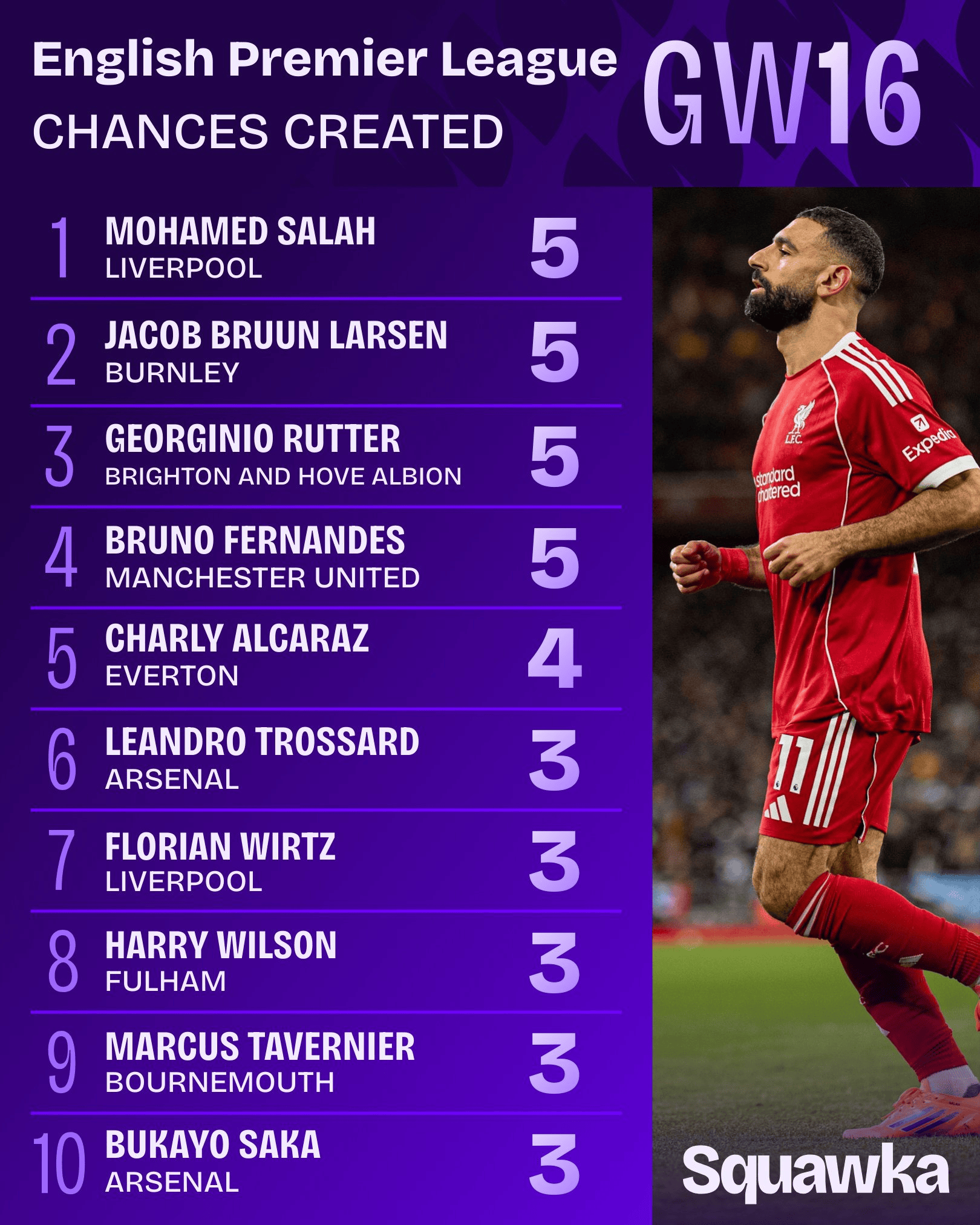 [流言板]英超第16輪創(chuàng )造機會(huì )榜:薩拉赫/B費/B