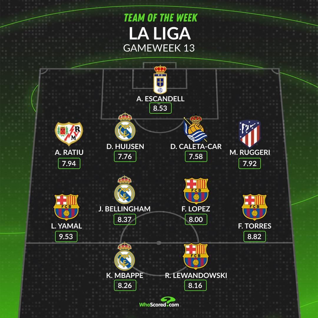 虎撲11月25日訊 WhoScored盤(pán)點(diǎn)西甲第13輪最佳陣容: