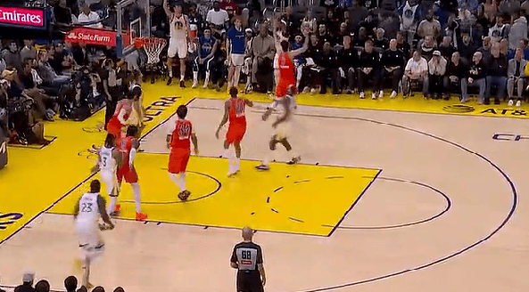 第四節比賽,球分強投小佩頓底角接球三分強投再中,再中勇士反超雷霆1分。勇士
