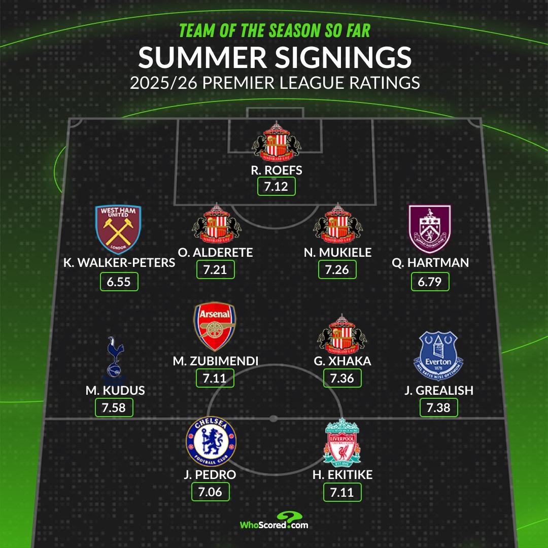 虎撲10月14日訊 Whoscored盤(pán)點(diǎn)本賽季至今英超夏窗新援最佳陣容,?;倏?、最佳陣埃蘇比門(mén)迪、基蒂庫杜斯、克蘇格拉利什、迪庫杜佩德羅等人入選。入選