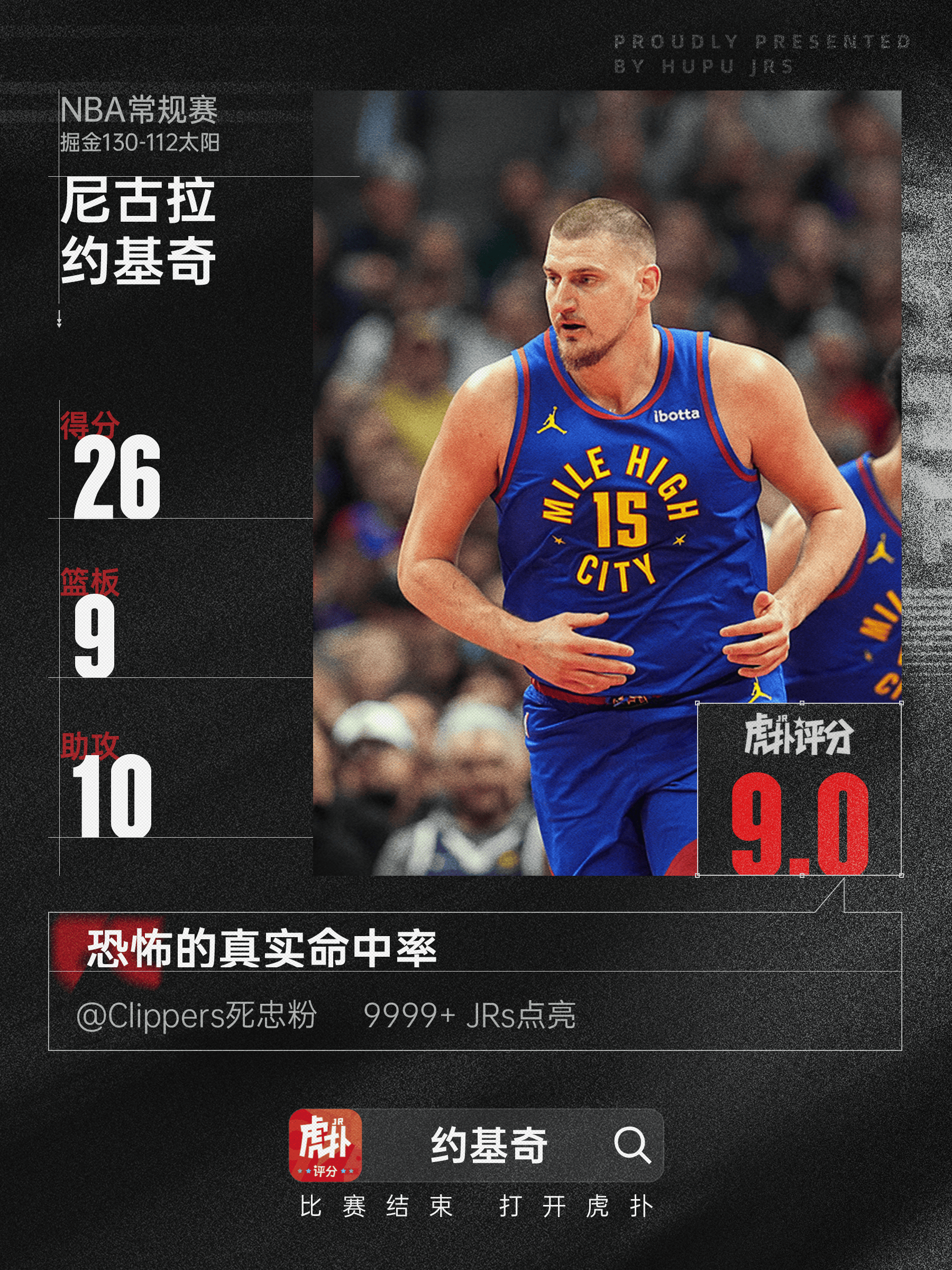 7投全中!投全約基奇全場(chǎng)砍下26分9籃板10助攻由虎撲籃球資訊 發(fā)表在籃球資訊 https://bbs.hupu.com/502