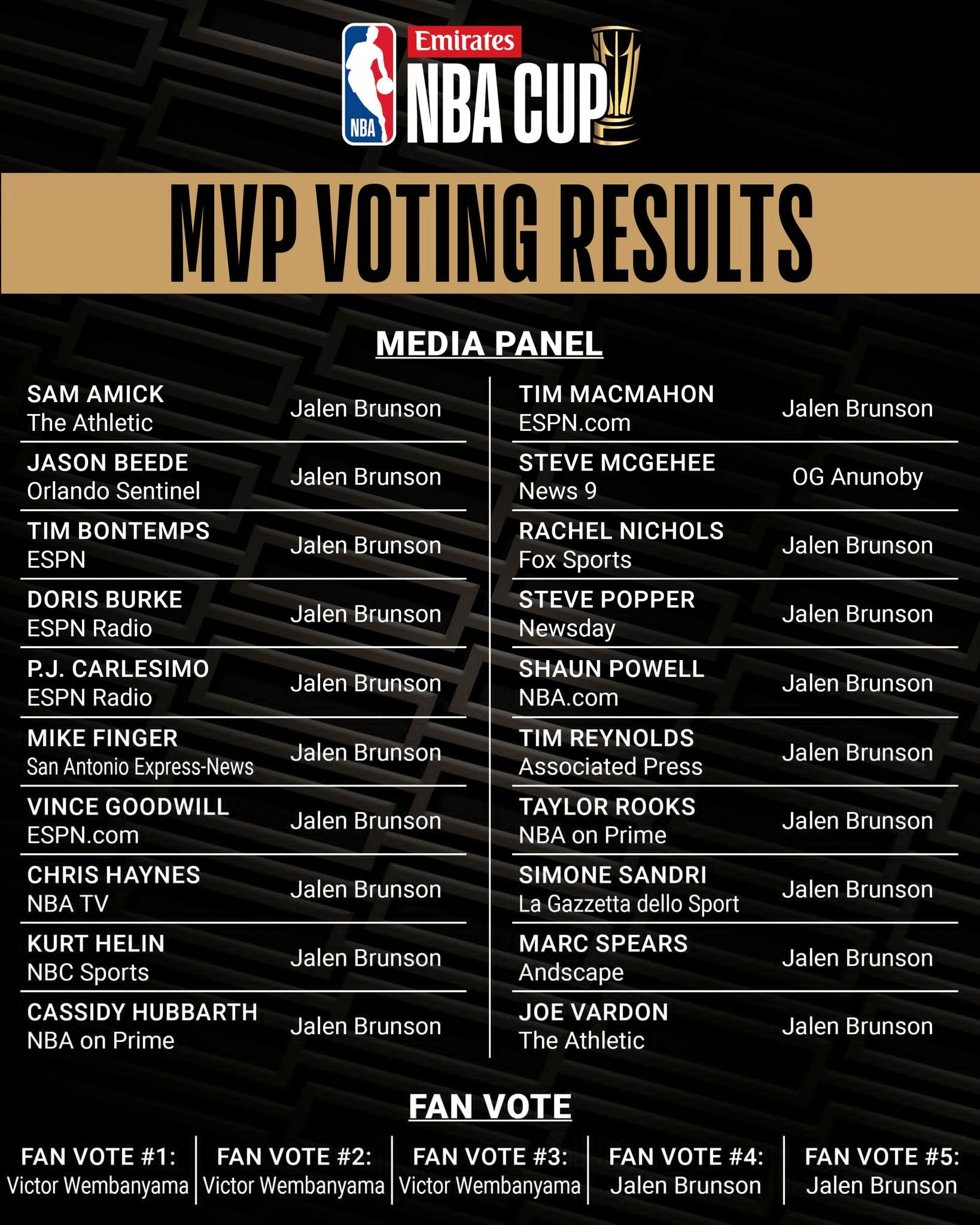 隨后記者Chris 板乎A杯布倫Haynes公布了NBA杯的MVP投票結果:19票布倫森,1票阿奴諾比。