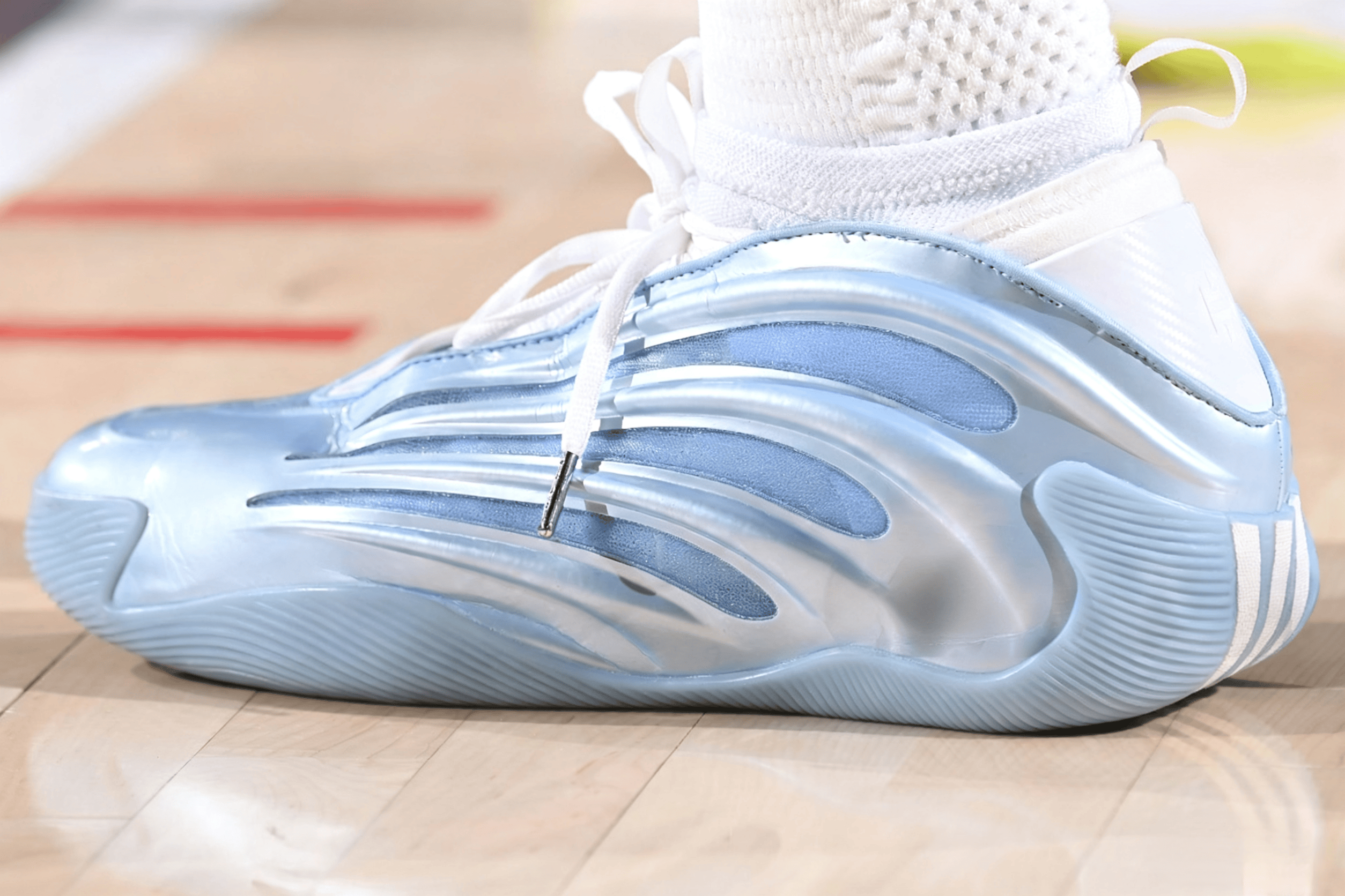 比賽中,板哈板助哈登上腳冰藍色adidas Harden Vol.9。登穿