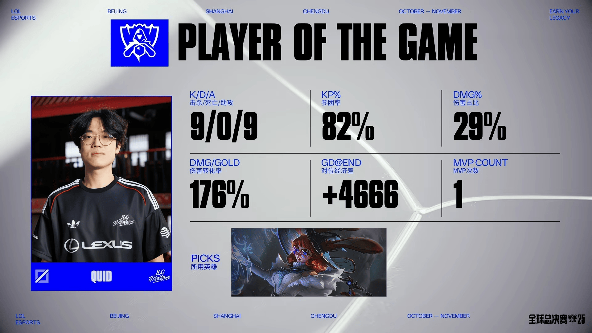 虎撲10月15日訊 在剛剛結束的S15瑞士輪的比賽中,Quid阿蘿拉砍下9/0/9的戰對陣戰績(jì),拿下100T對陣BLG全場(chǎng)MVP