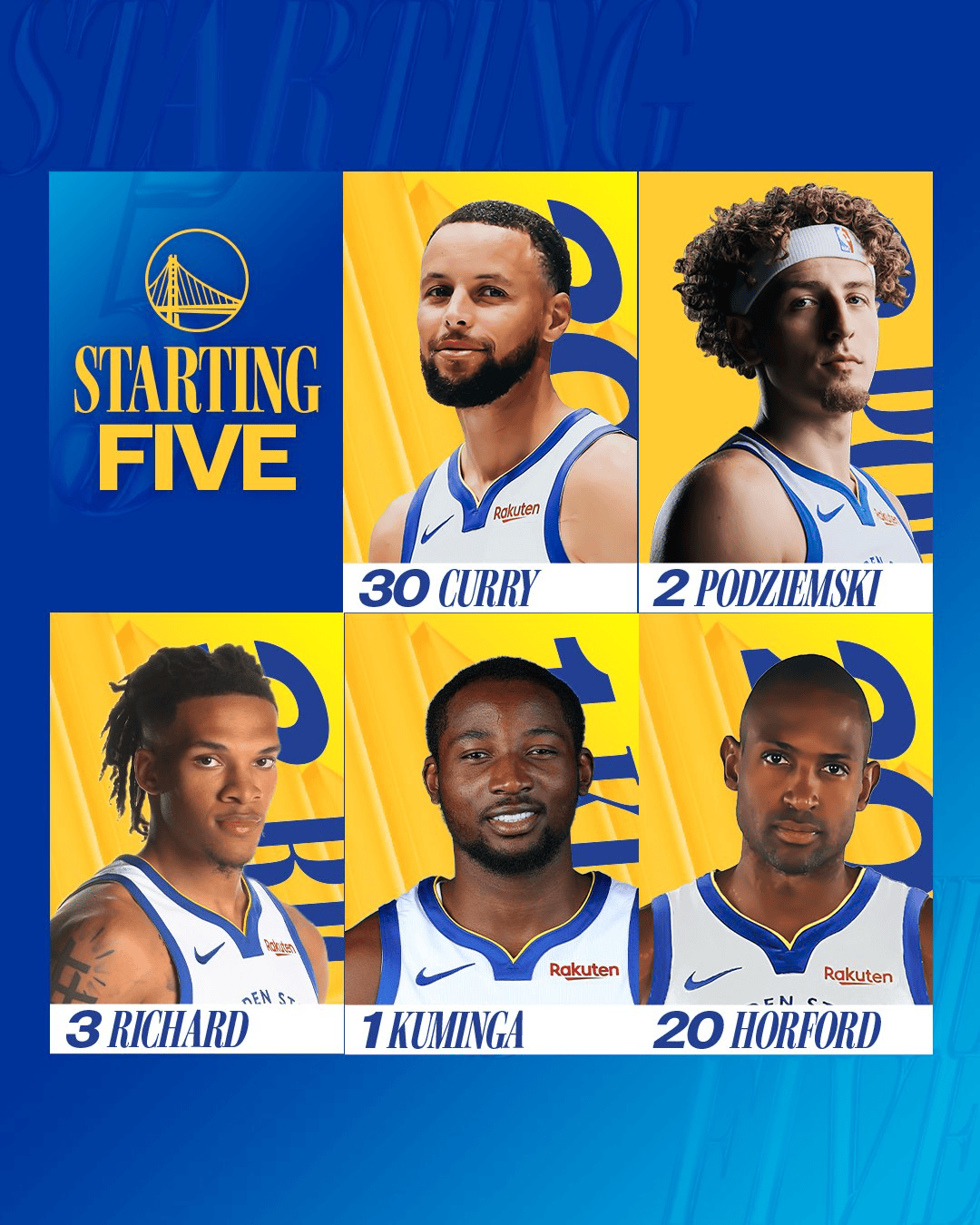 勇士本場(chǎng)首發(fā):斯蒂芬-庫里、德庫德布蘭丁-波杰姆斯基、明加威爾-理查德、喬納森-庫明加、艾爾-霍福德。